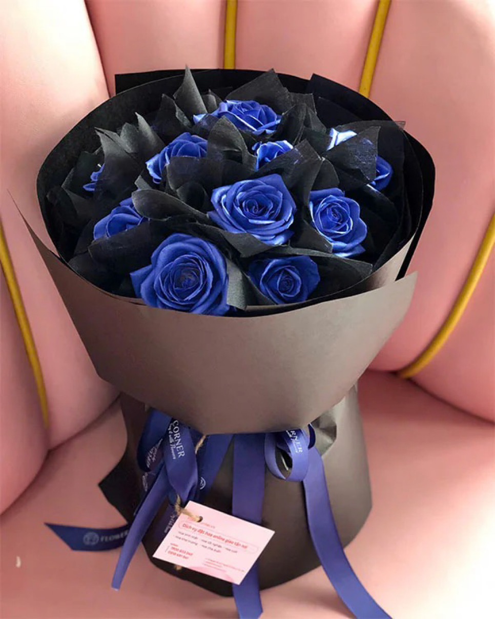 Sắc xanh trầm mang đến cảm giác bình tĩnh, sâu lắng và chín chắn, trong khi giấy gói đen làm nổi bật vẻ đẹp huyền bí của hoa, thể hiện chiều sâu cảm xúc và sự nghiêm túc trong thông điệp gửi gắm.