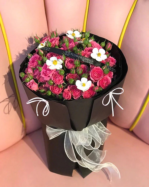 Bó hoa trong hình mang vẻ đẹp đáng yêu và tinh tế, nổi bật với những bông hồng hồng nhỏ tượng trưng cho tình yêu dịu dàng, sự quan tâm chân thành và những cảm xúc ngọt ngào. Điểm xuyết những hoa trắng xinh xắn thể hiện sự trong sáng, thuần khiết và lời chúc bình yên. Giấy gói đen hiện đại kết hợp cùng nơ trắng mềm mại tạo nên sự hài hòa giữa nét cá tính và nhẹ nhàng, gửi gắm thông điệp yêu thương tinh tế, mong người nhận luôn vui vẻ, hạnh phúc và được trân trọng mỗi ngày.