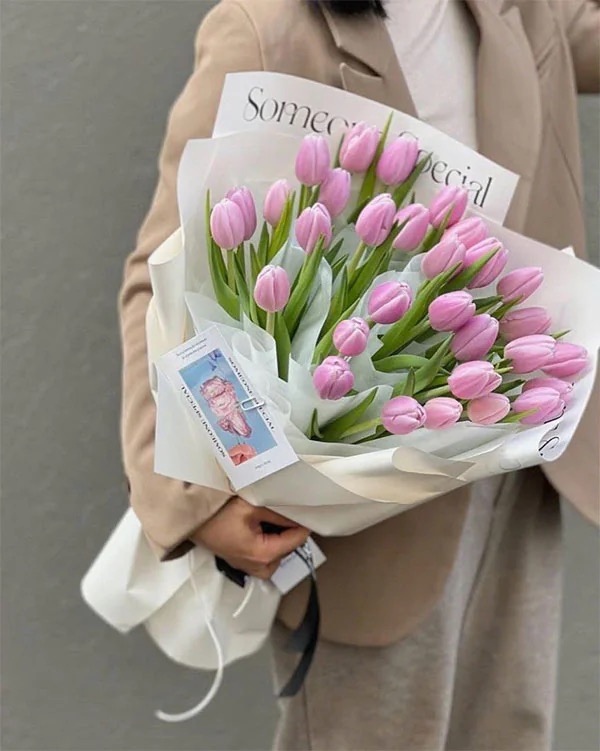 Bó hoa trong hình mang vẻ đẹp nhẹ nhàng và tinh tế, nổi bật với hoa tulip hồng tượng trưng cho sự dịu dàng, yêu thương chân thành và những cảm xúc ấm áp dành cho người đặc biệt. Sắc hồng pastel kết hợp cùng gam trắng trang nhã của giấy gói tạo cảm giác thanh lịch, hiện đại và êm ái. Tổng thể bó hoa gửi gắm thông điệp yêu thương tinh khôi, lời chúc ngọt ngào và sự trân trọng dành riêng cho “someone special” – người quan trọng trong trái tim.