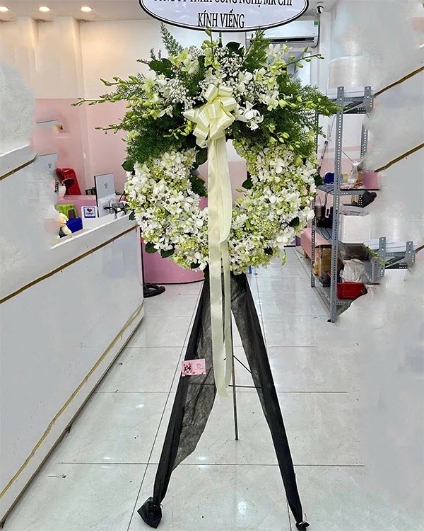 Vòng hoa chia buồn được thiết kế trang trọng với gam màu trắng chủ đạo, kết hợp hài hòa cùng sắc xanh của lá, tượng trưng cho sự tinh khiết, lòng thành kính và niềm tiếc thương sâu sắc đối với người đã khuất. Hình dáng vòng tròn khép kín mang ý nghĩa của sự vĩnh hằng, luân hồi và lời cầu chúc cho hương linh được an nghỉ nơi miền cực lạc. Mỗi loài hoa hiện diện là một lời tiễn biệt nhẹ nhàng, thay cho tấm lòng cảm thông, sẻ chia nỗi mất mát cùng gia quyến, đồng thời gửi gắm mong ước về sự bình an, nghị lực và niềm an ủi để những người ở lại sớm vượt qua đau thương.
