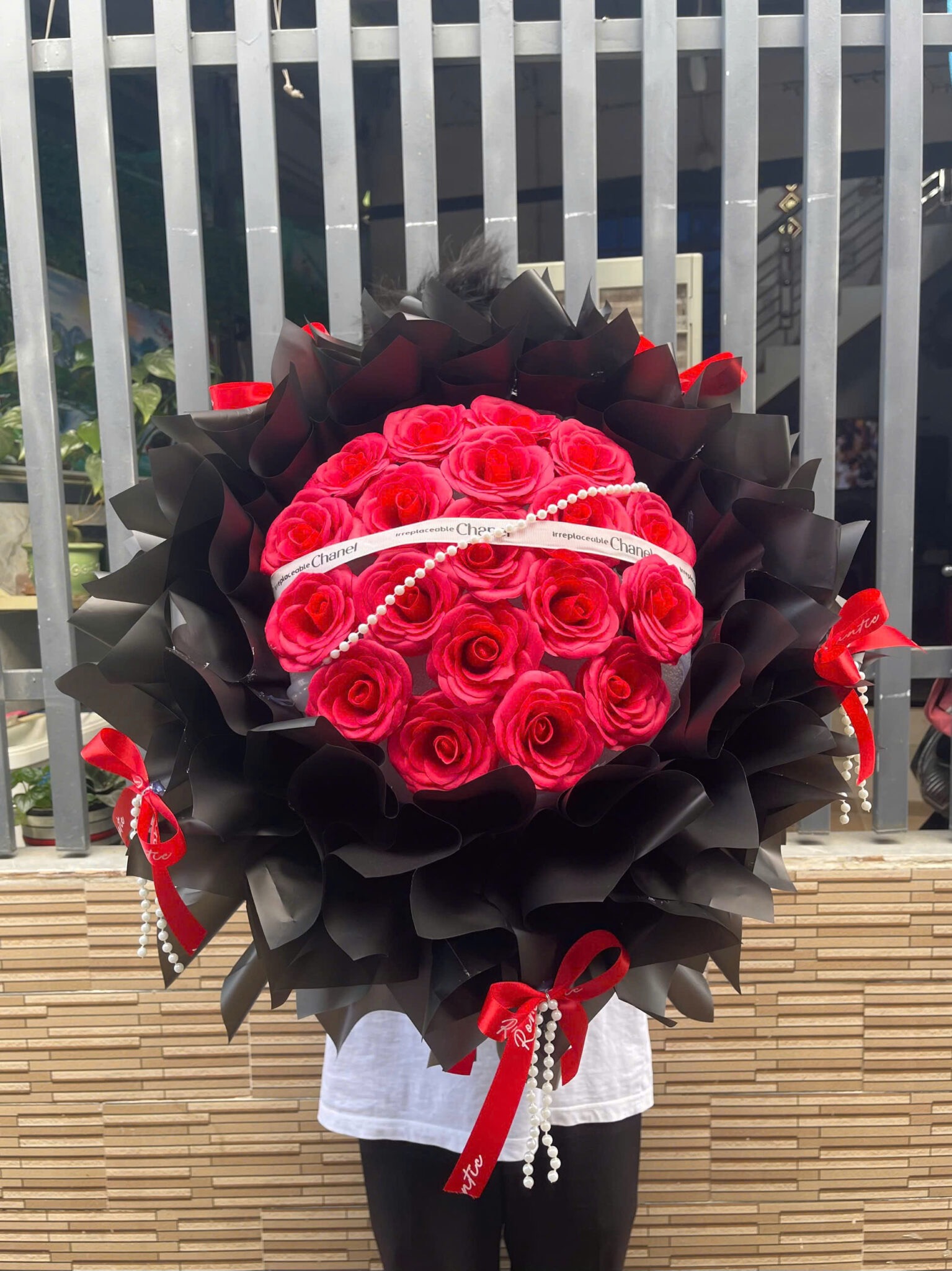 Lớp giấy gói màu đen tạo cảm giác sang trọng, bí ẩn, làm nổi bật sắc đỏ nổi bật của hoa, như sự che chở và bảo vệ cho tình cảm bên trong. Các chi tiết ruy băng đỏ và chuỗi ngọc trai càng nhấn mạnh thông điệp về sự quý giá, trân trọng và tình yêu được nâng niu cẩn thận. Tổng thể bó hoa gửi gắm lời nhắn: “Tình yêu này đủ mạnh mẽ để vượt qua mọi điều và đủ sâu để gắn bó dài lâu.” Bó hoa rất phù hợp để tặng trong những dịp bày tỏ tình cảm nghiêm túc, kỷ niệm tình yêu hoặc dành cho người thật sự đặc biệt.