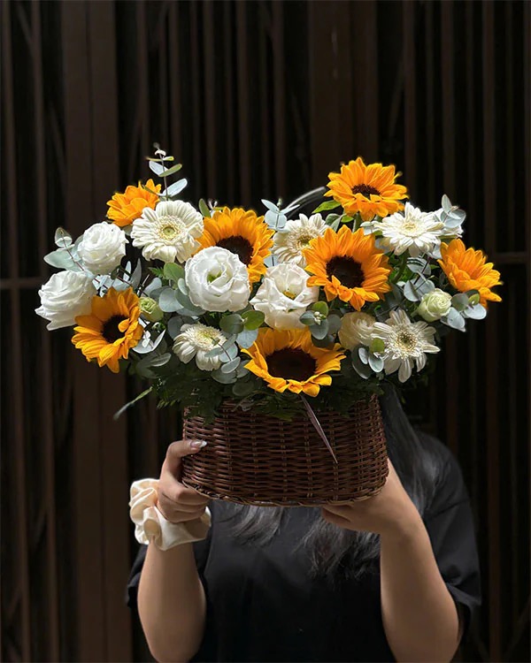 Giỏ hoa hướng dương vàng kết hợp cùng hoa trắng mang thông điệp lạc quan – hy vọng – khởi đầu tốt đẹp.