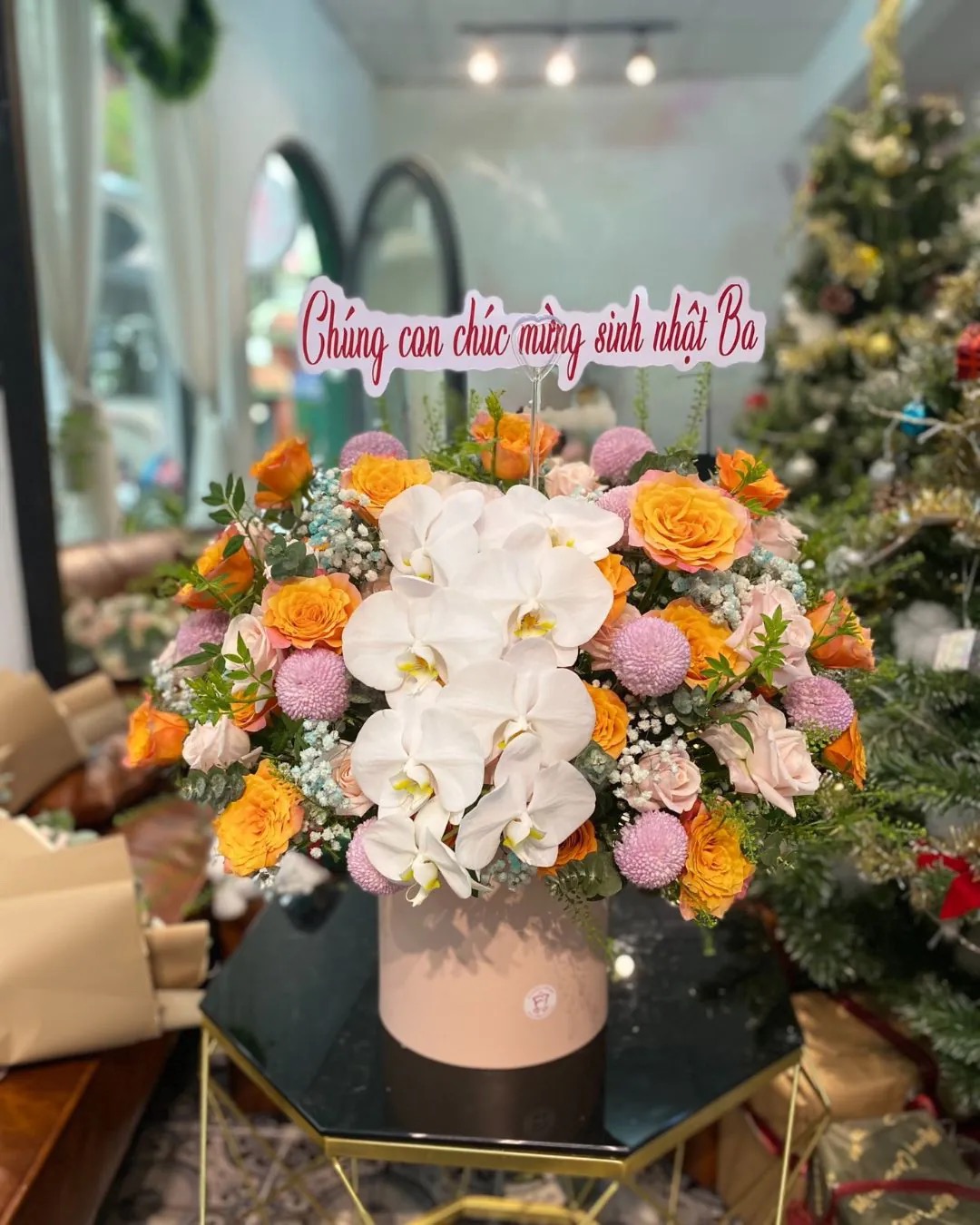 Lẵng hoa trong hình mang ý nghĩa trang trọng và ấm áp, được thiết kế nổi bật với hoa lan hồ điệp trắng tượng trưng cho sự cao quý, thanh khiết và lời chúc sức khỏe, an yên. Kết hợp cùng hoa hồng vàng – cam rực rỡ và hoa hồng phấndịu dàng, lẵng hoa thể hiện niềm vui, sự biết ơn và tình cảm yêu thương chân thành dành cho người nhận. Điểm xuyết các loài hoa tròn nhỏ và sắc xanh nhẹ nhàng tạo nên tổng thể hài hòa, gửi gắm thông điệp chúc mừng sinh nhật đầy yêu thương, mong người nhận luôn mạnh khỏe, hạnh phúc và tràn đầy niềm vui bên gia đình.